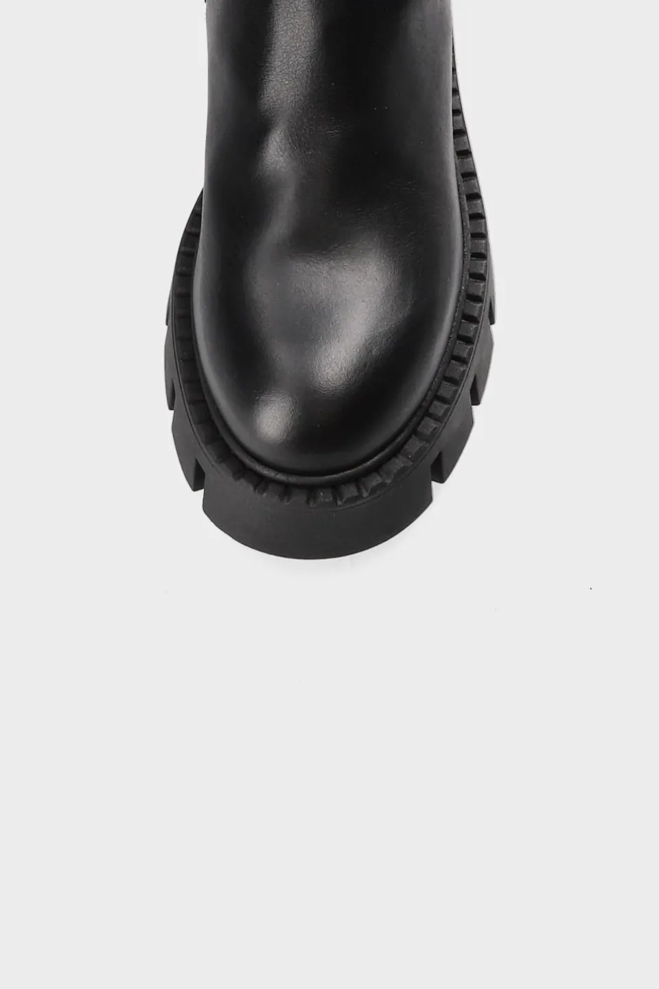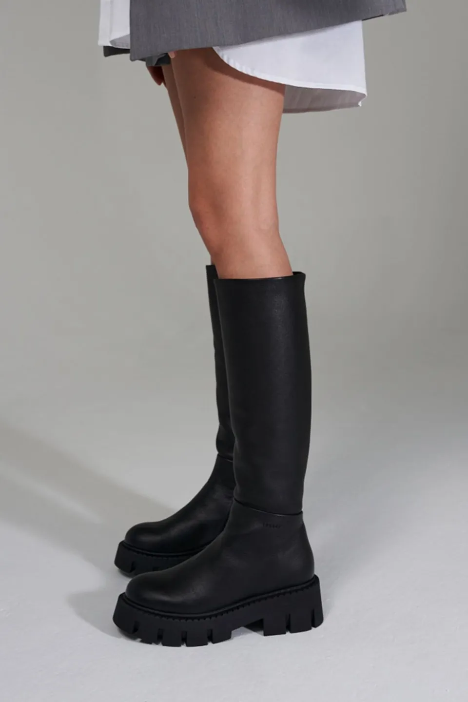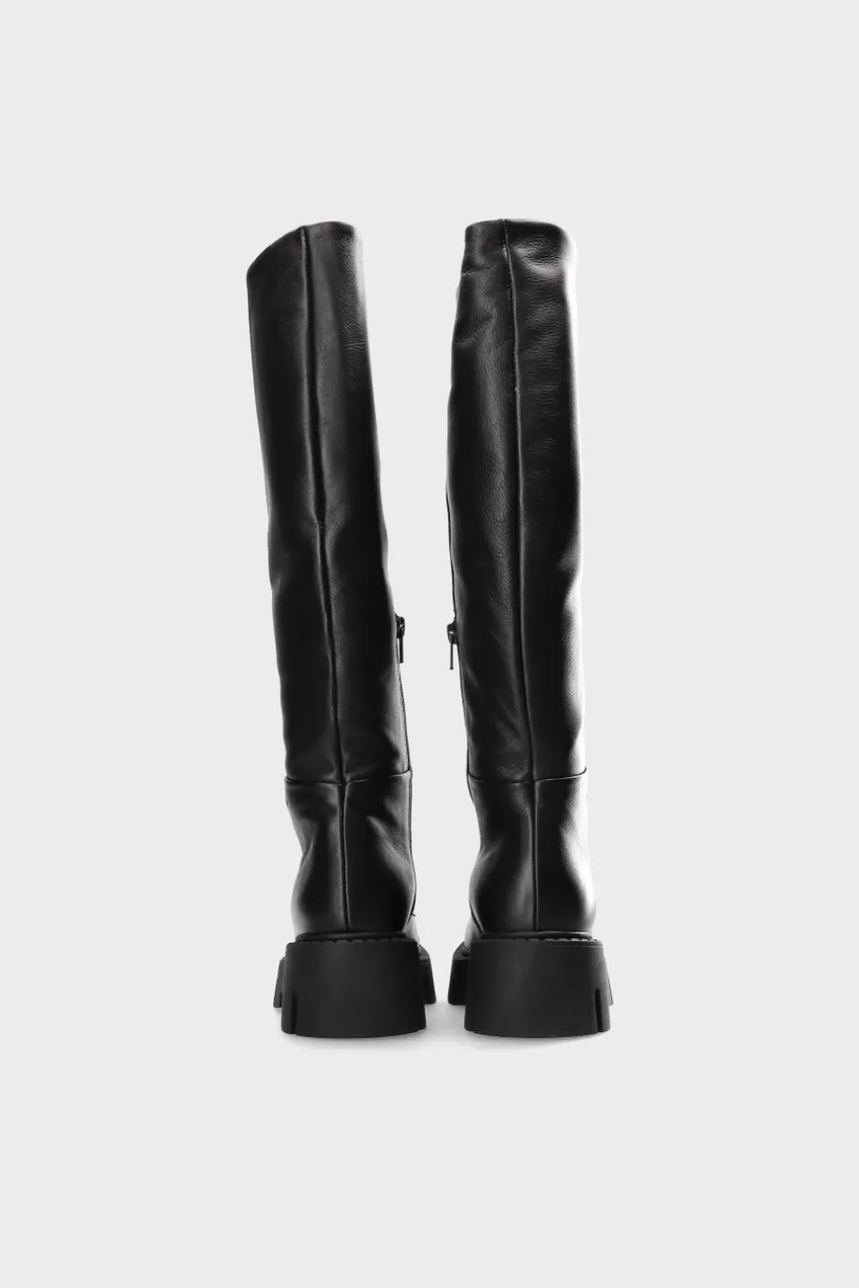 In Het Zwart. Kniehoge Laarzen Gemaakt Van Zacht, Glad Leer. Minimalistisch Silhouet Met Dikke Elementen. Rechte Schacht Met Geborduurde Details. Trek Het Lusje Aan De Achterkant. Rits In Dezelfde Kleur Aan De Binnenkant. Iets Taps Toelopend Teengedeelte. Robuuste Plateauzool Van Rubber Met Blokhak En Opvallend Profiel. Grove Elementen Ontmoeten Elegante Details Voor Een Frisse Look.Onze Schoenen Zijn Ontworpen In Kopenhagen En Gemaakt In Europa. Het Leer Komt Uit Geselecteerde Familiebedrijven In Italië.