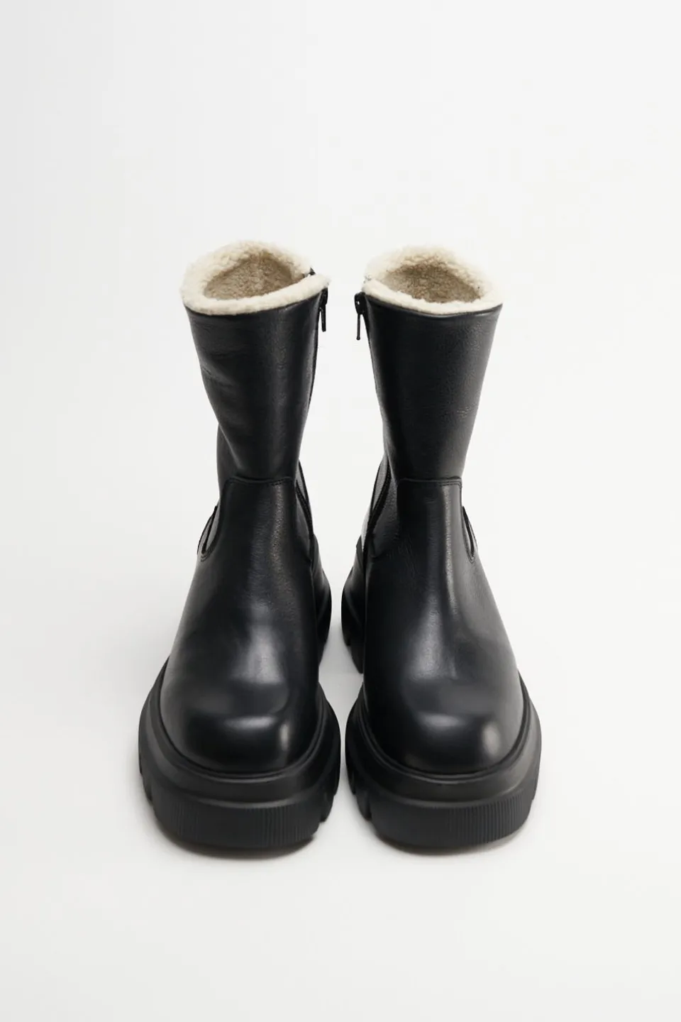 In Het Zwart. Enkellaarzen Gemaakt Van Glad Leer Met Vegan Teddy Voering. Grof Silhouet. Iets Vierkante Dop. Rits Aan De Binnenkant. Tonale Hardware. Contrasterende Elementen En Geborduurde Details. Een Relaxte Stijl Voor Koude Dagen.Onze Schoenen Zijn Ontworpen In Kopenhagen En Gemaakt In Europa. Het Leer Komt Uit Geselecteerde Familiebedrijven In Italië.
