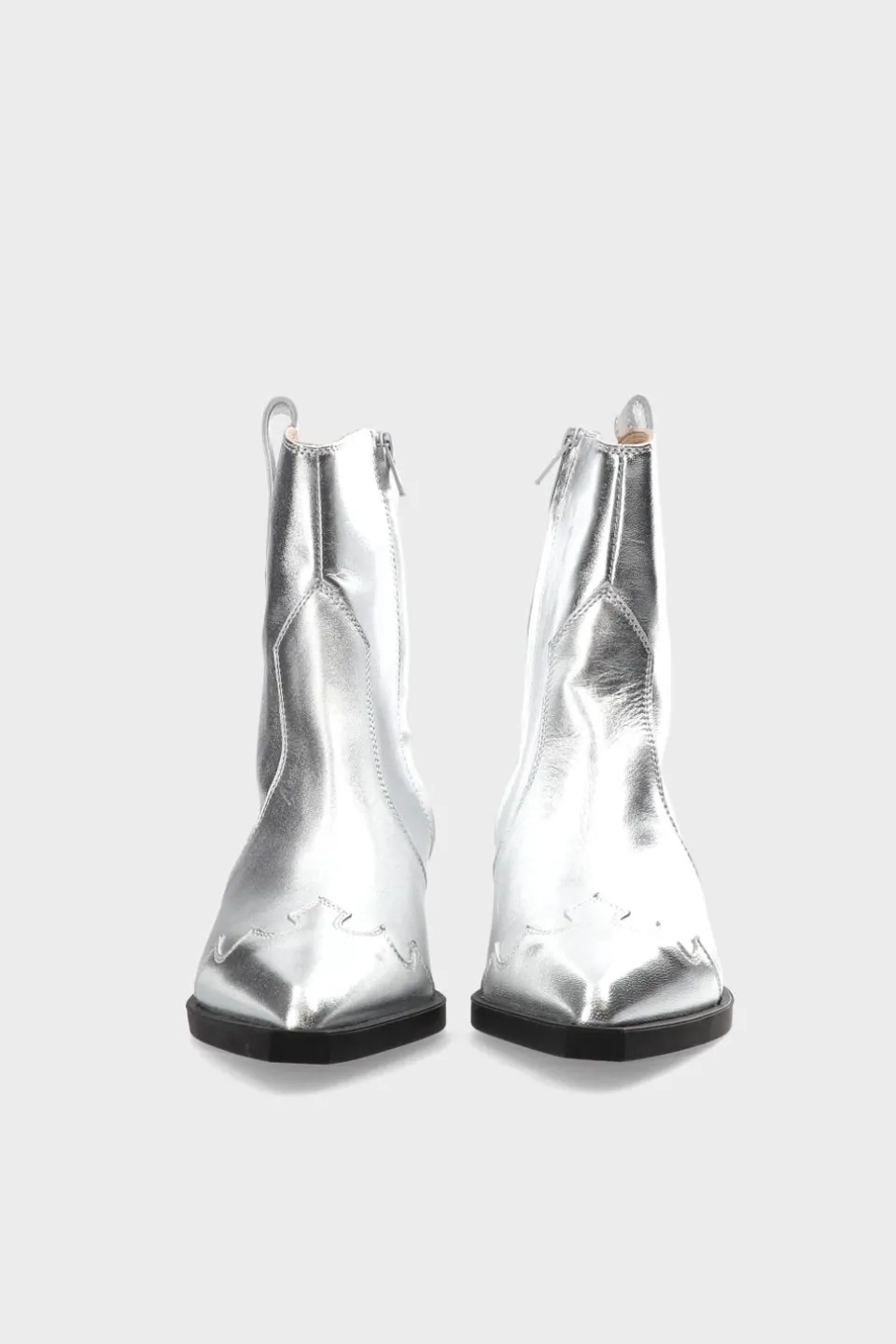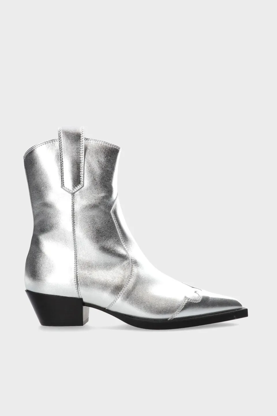 In Zilver. Enkelhoge Texano Enkellaarzen Gemaakt Van Glad Leer. Slank Silhouet. Brede Schacht. Contrasterende Elementen Met Applicaties En Geborduurde Details. Rits Aan De Binnenkant. Trek De Lus Aan De Buitenkant. Rechthoekig Gevormd, Spitse Neus. Gladde Rubberen Zool Met Schuine Blokhak. Elegante Texano-Enkellaarzen Voor Een Expressieve Look.Onze Schoenen Zijn Ontworpen In Kopenhagen En Vervaardigd In Europa. Het Leer Is Afkomstig Van Geselecteerde, Door Een Familie Gerunde Fabrieken In Italië.