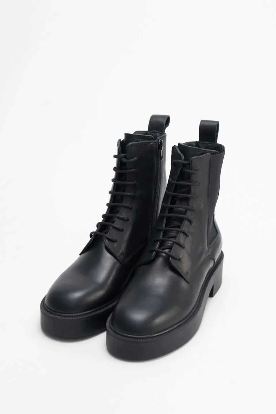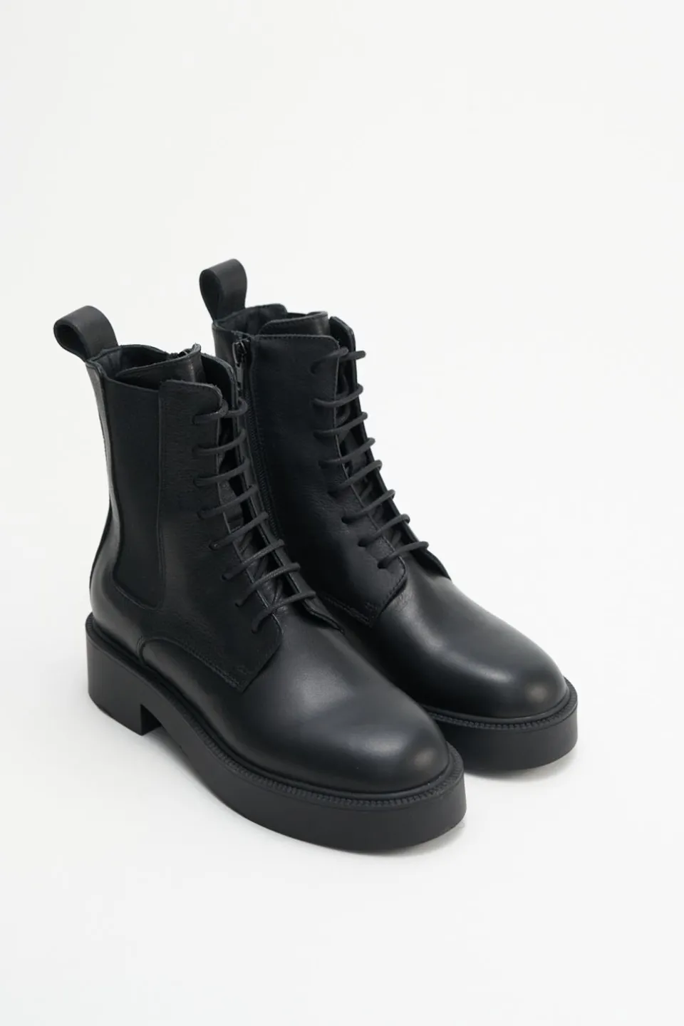In Het Zwart. Chelsea Boots Met Veters Van Glad Leer. Enkelhoog Gevechtssilhouet. Met Contrasterende Elementen, Tonale Veters En Elastische Inzetstukken. Trek De Lus Aan De Schacht. Een Chelsea-Stijl Die Comfortabel, Stijlvol En Veelzijdig Is.Onze Schoenen Zijn Ontworpen In Kopenhagen En Gemaakt In Europa. Het Leer Komt Uit Geselecteerde, Door Een Familie Gerunde Fabrieken In Italië.