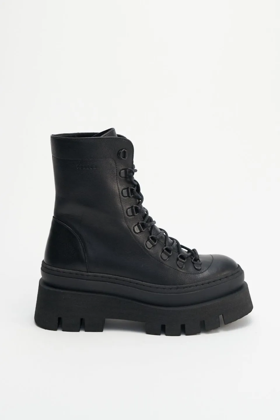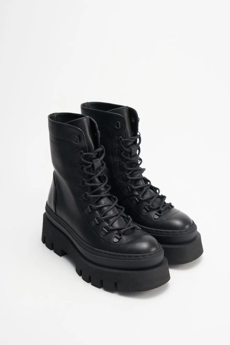 In Het Zwart. Middelhoge Veterlaarzen Gemaakt Van Glad Leer. Gevechtssilhouet Met Ronde Dop. Tonale Veters En Hardware. Gestempeld Logo Aan De Buitenkant. Een Expressieve Stijl Die Je Op Elke Situatie Voorbereidt.Onze Schoenen Zijn Ontworpen In Kopenhagen En Vervaardigd In Europa. Het Leer Komt Uit Geselecteerde Familiebedrijven In Italië.