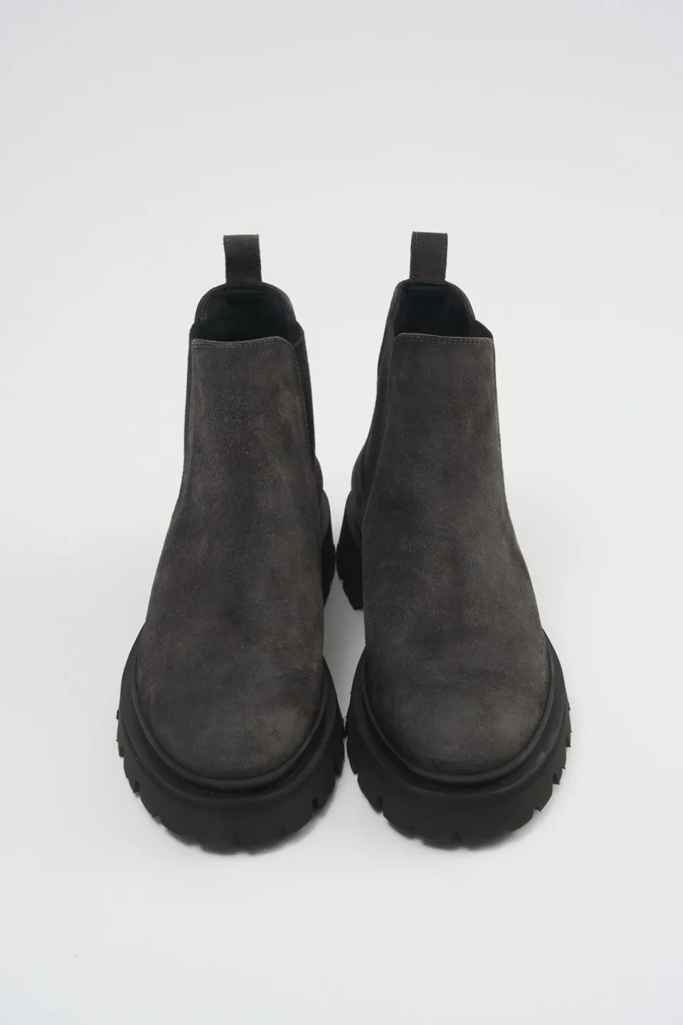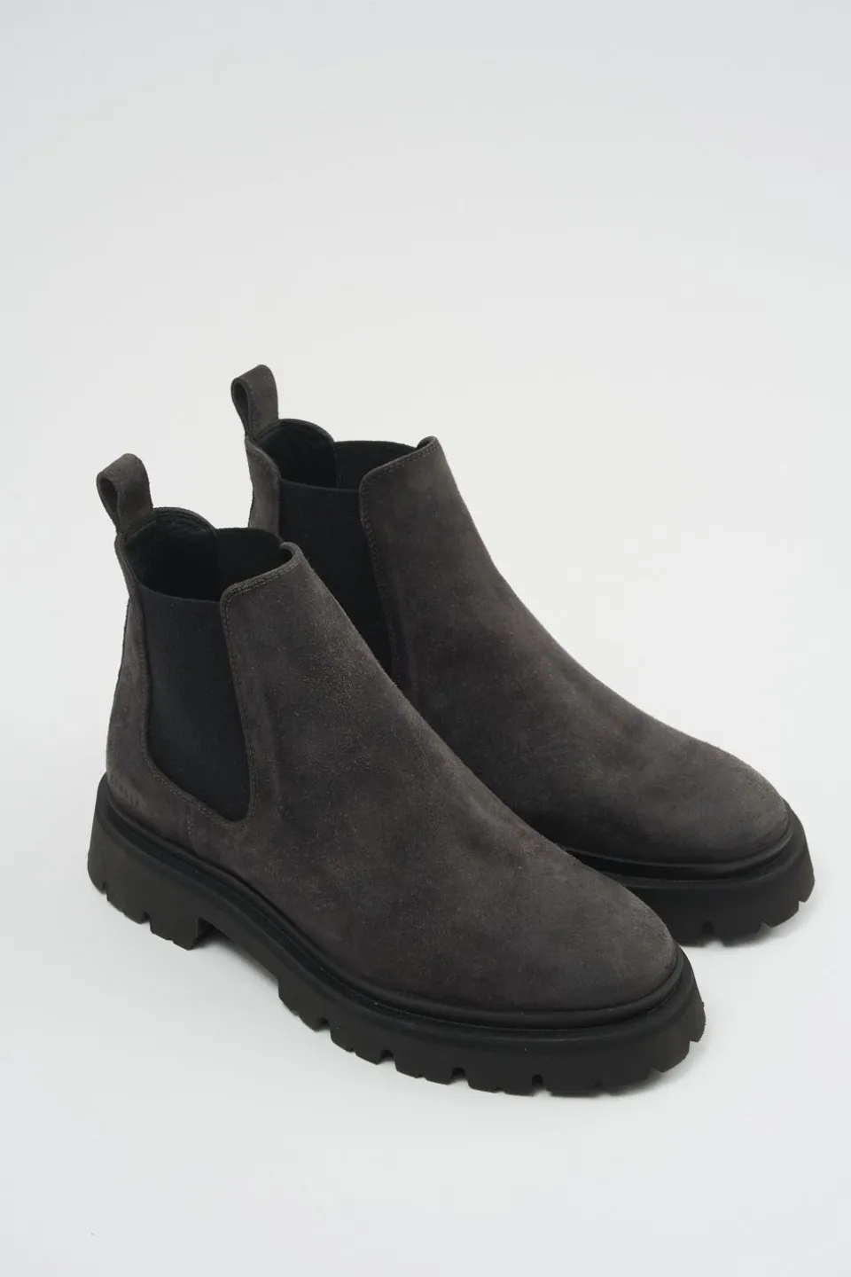 In Antraciet. Lage Chelsea Boots Gemaakt Van Zacht Suède. Minimalistisch Silhouet. Elastische Zijpanelen. Geborduurde Details. Trek Het Lusje Aan De Achterkant. Logo Aan De Buitenkant. Robuuste Rubberen Zool Met Grof Profiel, Blokhak En Spatbord. Minimalistische Chelsea Boots Met Een Speciale Afwerking.Onze Schoenen Zijn Ontworpen In Kopenhagen En Gemaakt In Europa. Het Leer Is Afkomstig Van Geselecteerde, Door Een Familie Gerunde Fabrieken In Italië.