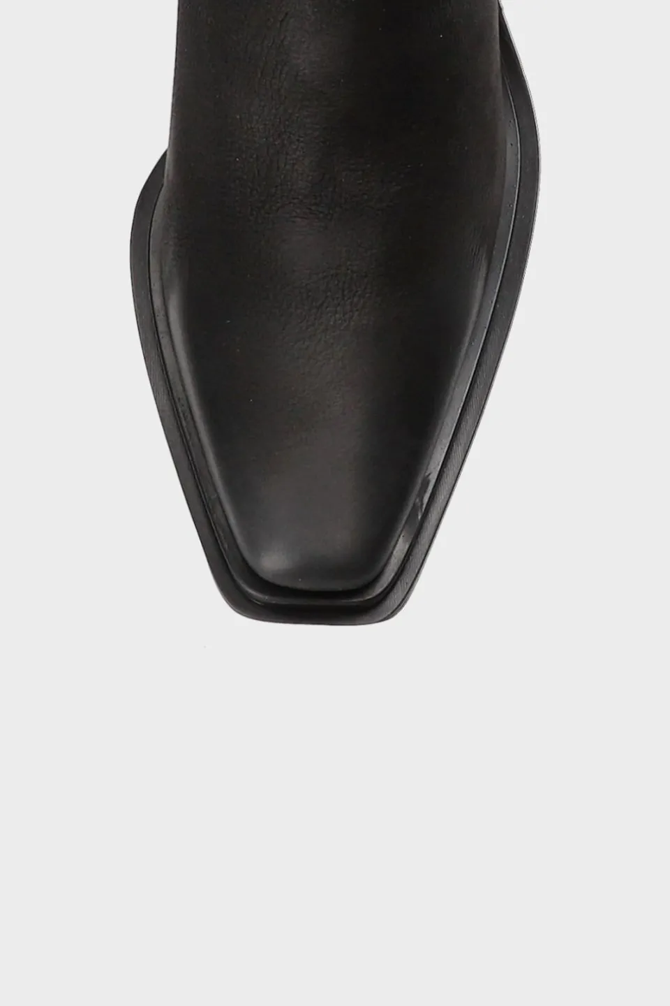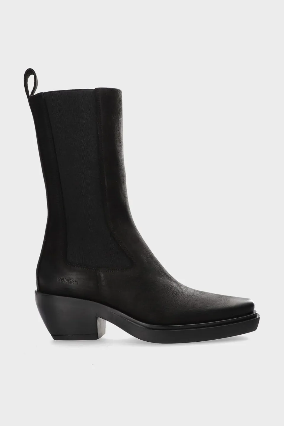 In Het Zwart. Hoge Laarzen Gemaakt Van Gewaxt Nubuckleer. Texano-Geïnspireerd Silhouet. Smalle Schacht. Geborduurde Details. Logo Aan De Buitenkant. Rechthoekig Gevormd, Puntig Teengedeelte. Trek Het Lusje Aan De Achterkant. Gladde Rubberen Zool Met Schuine Blokhak. Minimalistische, Elegante Texano-Enkellaarzen In Een Monochrome Look.Onze Schoenen Zijn Ontworpen In Kopenhagen En Vervaardigd In Europa. Het Leer Is Afkomstig Van Geselecteerde, Door Een Familie Gerunde Fabrieken In Italië.