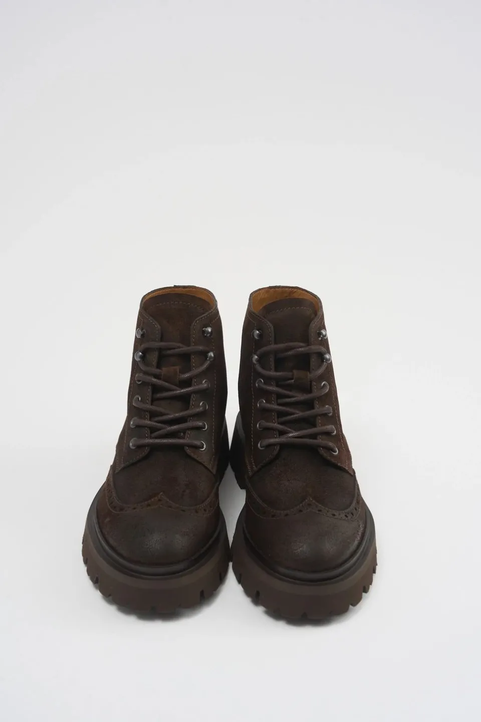 In Chocolade. Enkelhoge Veterschoenen Van Gewaxt Suède. Klassiek Silhouet. Modern Kantpatroon In Broguestijl. Contrasterende Elementen Met Geborduurde Details. Vetersluiting Aan De Voorkant. Ronde Neus. Robuuste Rubberen Zool Met Grof Profiel, Blokhak En Spatbord. Weerbestendige Laarzen Voor Koele Winterdagen.Onze Schoenen Zijn Ontworpen In Kopenhagen En Vervaardigd In Europa. Het Leer Is Afkomstig Van Geselecteerde, Door Een Familie Gerunde Fabrieken In Italië.