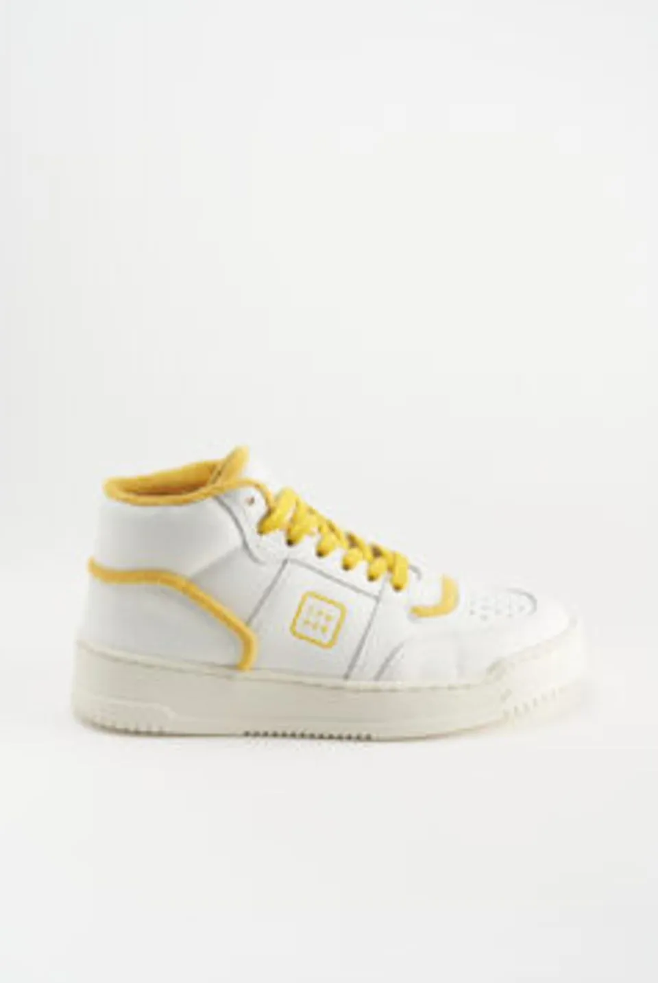 In Wit & Geel. Hoge Sneakers Gemaakt Van Glad Leer. Retrosilhouet. Gevoerde Schacht. Contrasterende Elementen Met Geborduurde Details En Kantpatronen. Logo-Statement In Reliëf Aan De Buitenkant. Vetersluiting Aan De Voorkant. Ronde Dop. Platte Gestructureerde Rubberen Zool. Een Expressieve Retrostijl Met Kleurrijke Accenten.Onze Schoenen Zijn Ontworpen In Kopenhagen En Vervaardigd In Europa. Het Leer Is Afkomstig Van Geselecteerde, Door Een Familie Gerunde Fabrieken In Italië.