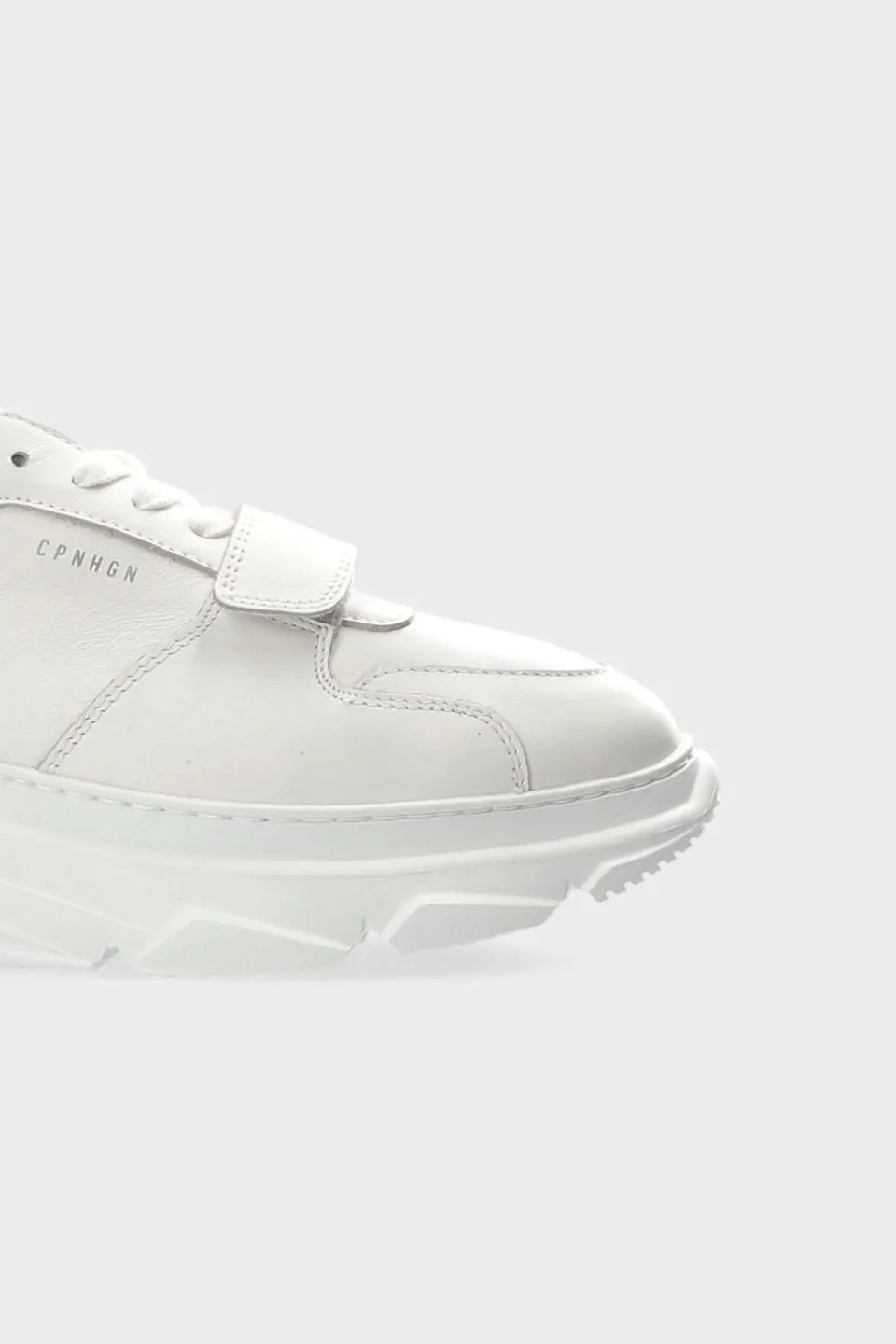 In Het Wit. Platformsneakers Van Glad Leer Met Contrastnaden En Klittenbandsluiting. Geprofileerde Buitenzool. Labelbadge Op De Tong. Zachte Treklus Op De Hiel. Extra Stijlvol, Met Dat Beetje Extra.Onze Schoenen Zijn Ontworpen In Kopenhagen En Gemaakt In Europa.