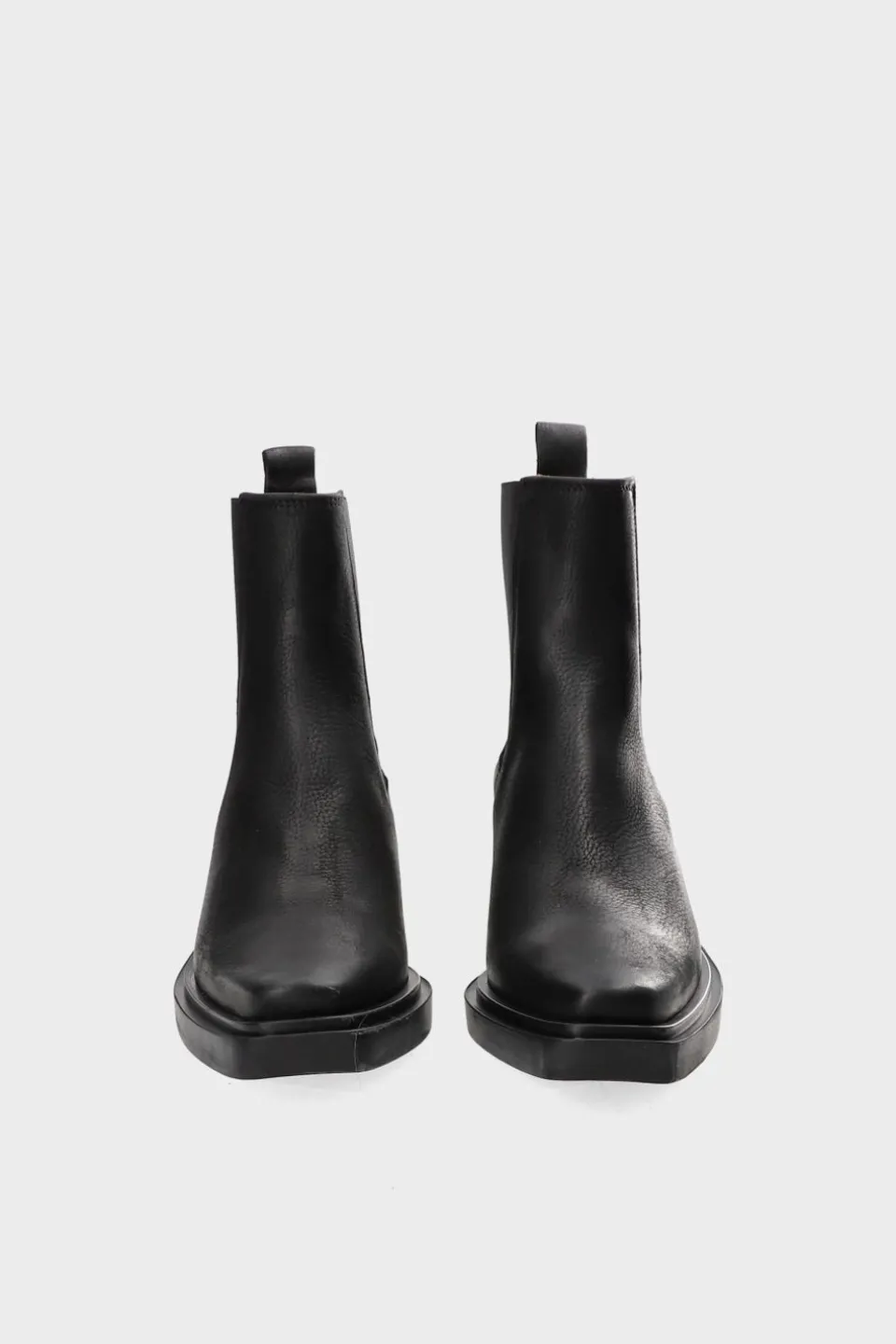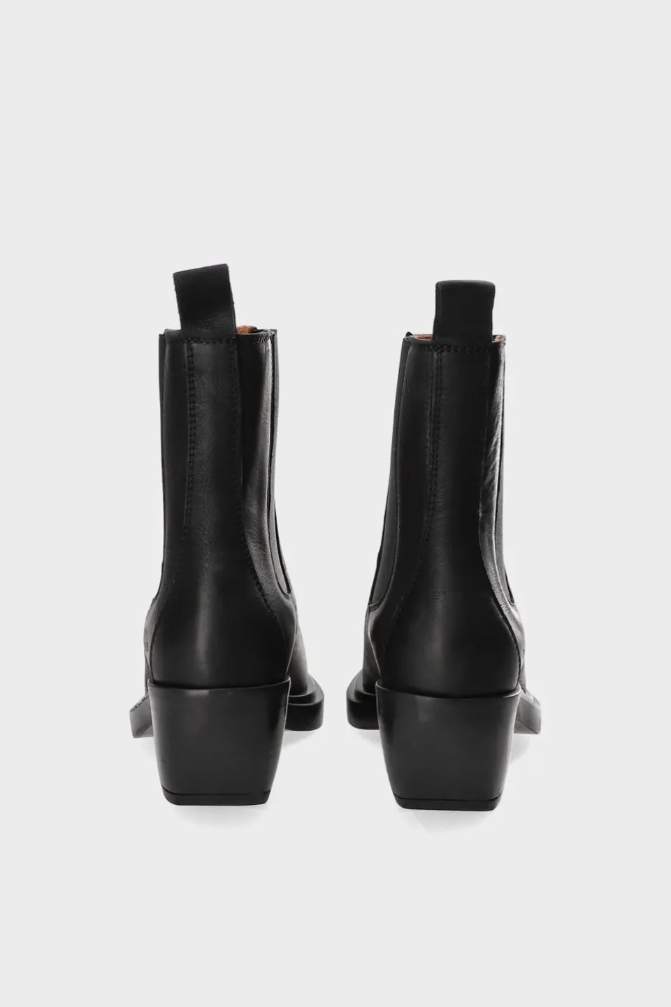 In Het Zwart. Middelhoge Chelsea Boots Gemaakt Van Gewaxt Nubuckleer. Texano-Geïnspireerd Silhouet. Smalle Schacht. Elastische Zijpanelen. Geborduurde Details. Logo Aan De Buitenkant. Rechthoekig Gevormd, Puntig Teengedeelte. Trek Het Lusje Aan De Achterkant. Gladde Rubberen Zool Met Schuine Blokhak. Minimalistische Texano-Enkellaarzen In Een Monochrome Look.Onze Schoenen Zijn Ontworpen In Kopenhagen En Gemaakt In Europa. Het Leer Komt Uit Geselecteerde, Door Een Familie Gerunde Fabrieken In Italië.