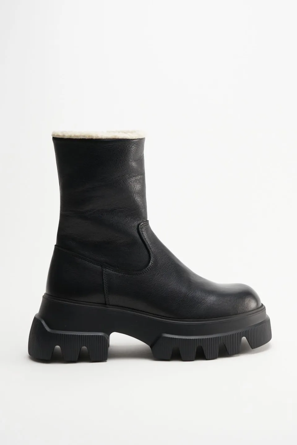In Het Zwart. Enkellaarzen Gemaakt Van Glad Leer Met Vegan Teddy Voering. Grof Silhouet. Iets Vierkante Dop. Rits Aan De Binnenkant. Tonale Hardware. Contrasterende Elementen En Geborduurde Details. Een Relaxte Stijl Voor Koude Dagen.Onze Schoenen Zijn Ontworpen In Kopenhagen En Gemaakt In Europa. Het Leer Komt Uit Geselecteerde Familiebedrijven In Italië.