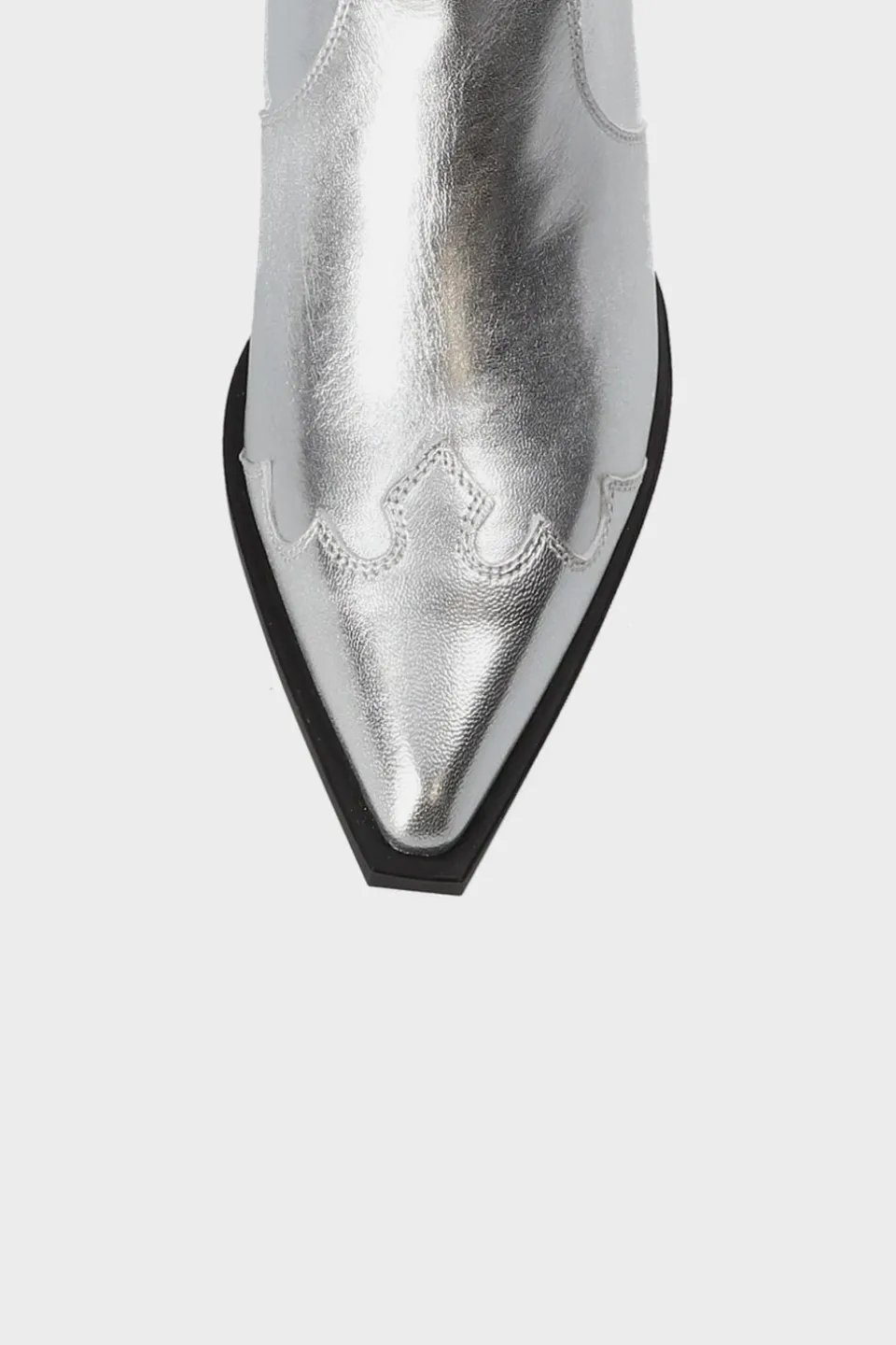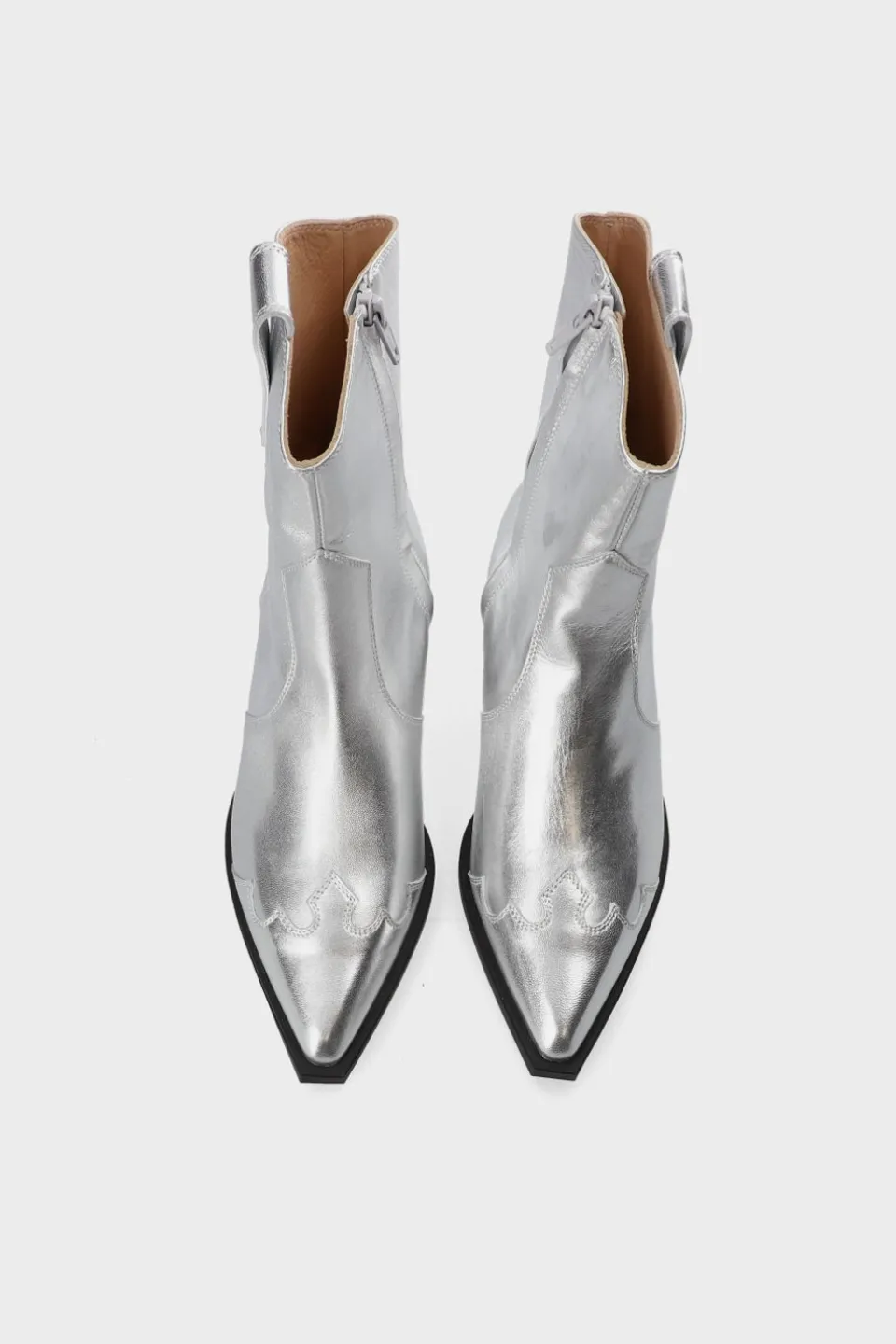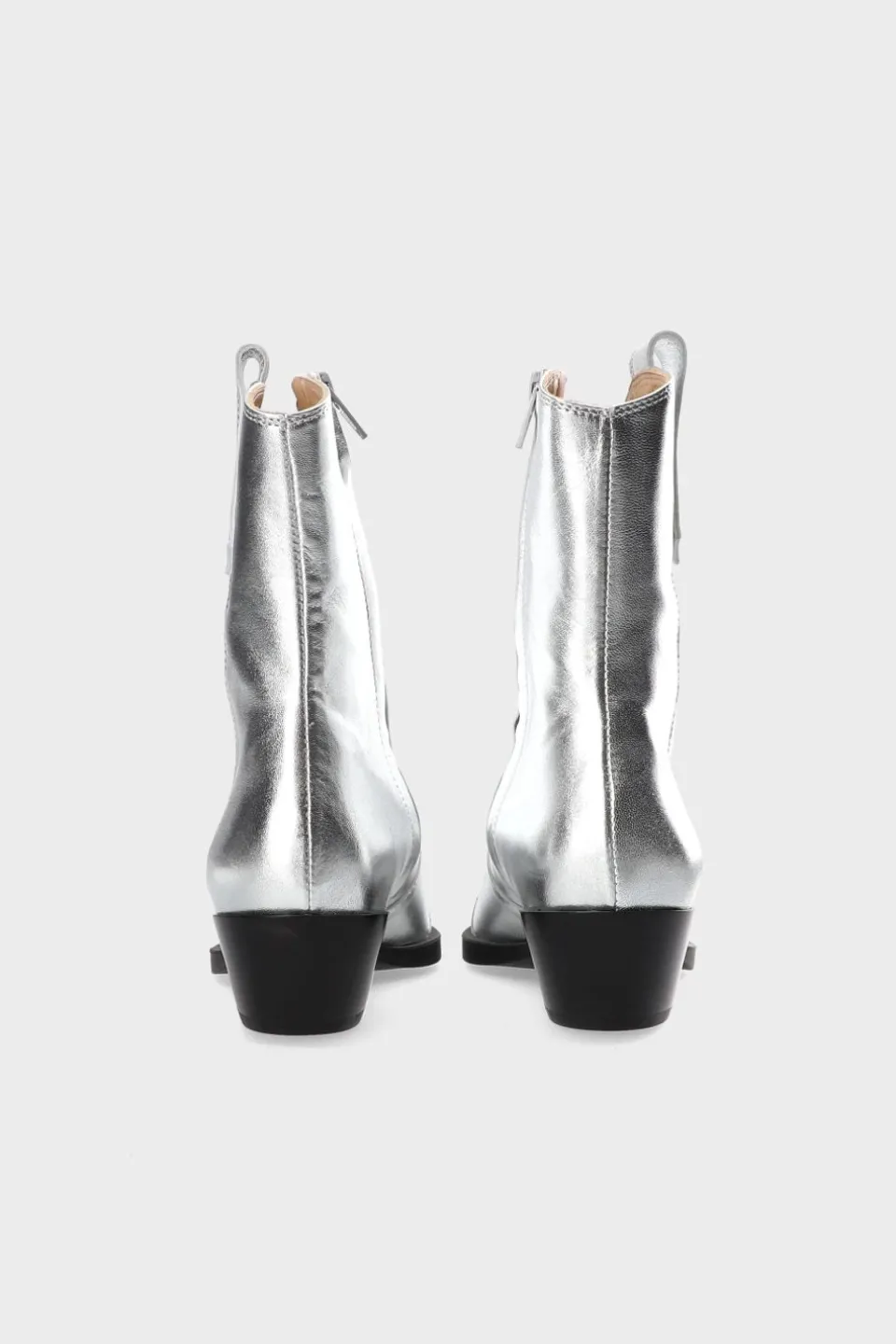 In Zilver. Enkelhoge Texano Enkellaarzen Gemaakt Van Glad Leer. Slank Silhouet. Brede Schacht. Contrasterende Elementen Met Applicaties En Geborduurde Details. Rits Aan De Binnenkant. Trek De Lus Aan De Buitenkant. Rechthoekig Gevormd, Spitse Neus. Gladde Rubberen Zool Met Schuine Blokhak. Elegante Texano-Enkellaarzen Voor Een Expressieve Look.Onze Schoenen Zijn Ontworpen In Kopenhagen En Vervaardigd In Europa. Het Leer Is Afkomstig Van Geselecteerde, Door Een Familie Gerunde Fabrieken In Italië.