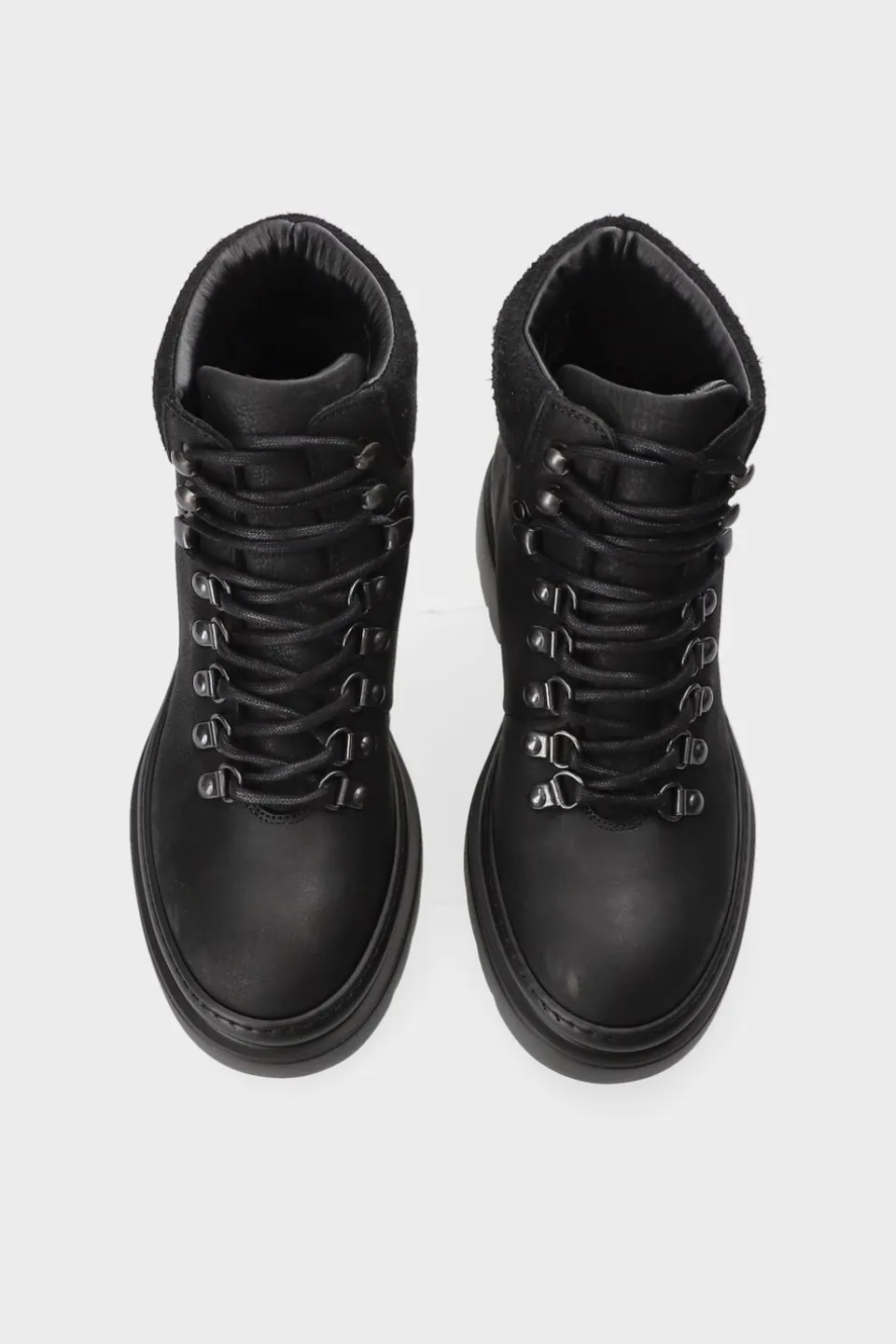 In Het Zwart. Enkelhoge Veterschoenen Van Gewaxt Nubuckleer. Trekking Silhouet. Vintage Elementen En Geborduurde Details. Vetersluiting Aan De Voorkant. Gevoerde Schacht. Ronde Neus. Gestikte Rubberen Zool Met Licht Profiel, Blokhak En Spatbord. Trekkingschoenen Met Nieuwe Elementen En Vintage Details.Onze Schoenen Zijn Ontworpen In Kopenhagen En Gemaakt In Europa. Het Leer Is Afkomstig Van Geselecteerde, Door Een Familie Gerunde Fabrieken In Italië.