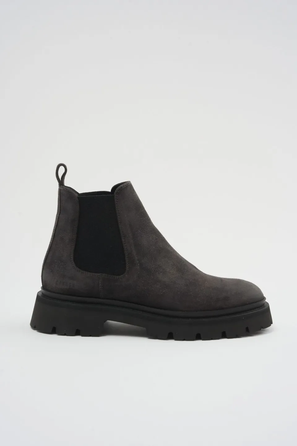 In Antraciet. Lage Chelsea Boots Gemaakt Van Zacht Suède. Minimalistisch Silhouet. Elastische Zijpanelen. Geborduurde Details. Trek Het Lusje Aan De Achterkant. Logo Aan De Buitenkant. Robuuste Rubberen Zool Met Grof Profiel, Blokhak En Spatbord. Minimalistische Chelsea Boots Met Een Speciale Afwerking.Onze Schoenen Zijn Ontworpen In Kopenhagen En Gemaakt In Europa. Het Leer Is Afkomstig Van Geselecteerde, Door Een Familie Gerunde Fabrieken In Italië.