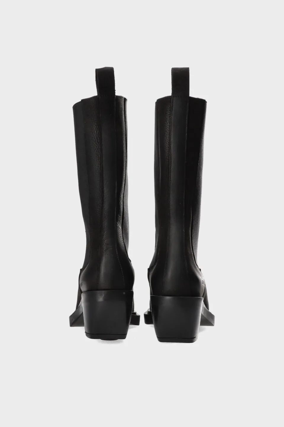 In Het Zwart. Hoge Laarzen Gemaakt Van Gewaxt Nubuckleer. Texano-Geïnspireerd Silhouet. Smalle Schacht. Geborduurde Details. Logo Aan De Buitenkant. Rechthoekig Gevormd, Puntig Teengedeelte. Trek Het Lusje Aan De Achterkant. Gladde Rubberen Zool Met Schuine Blokhak. Minimalistische, Elegante Texano-Enkellaarzen In Een Monochrome Look.Onze Schoenen Zijn Ontworpen In Kopenhagen En Vervaardigd In Europa. Het Leer Is Afkomstig Van Geselecteerde, Door Een Familie Gerunde Fabrieken In Italië.